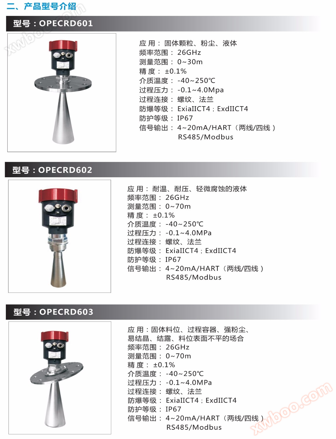 OPECRD60系列26G高頻雷達式物位測量儀表,引進技術,采用進口表頭,打造國內品牌。天線被進一步優化處理,新型快速的微處理器可以進行更高速率的信號分析處理,測量距離可達80米,使得儀表可以用于各種強腐蝕性液體的測量。